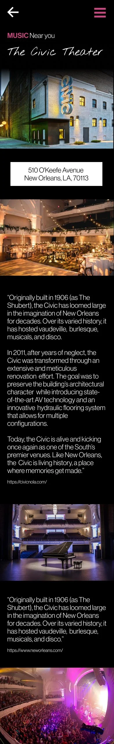 The assignment was to create a map highlighting locations that I wanted the audience to visit. I created a map app that doubled as a tourism site, showing the user nearby activities, food, music venues, and clubs.